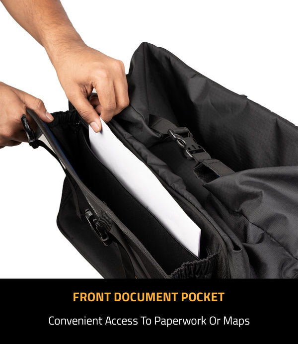 • Stash Pockets: 2 front gusseted stash pockets for storing rain liners, tool rolls, etc.